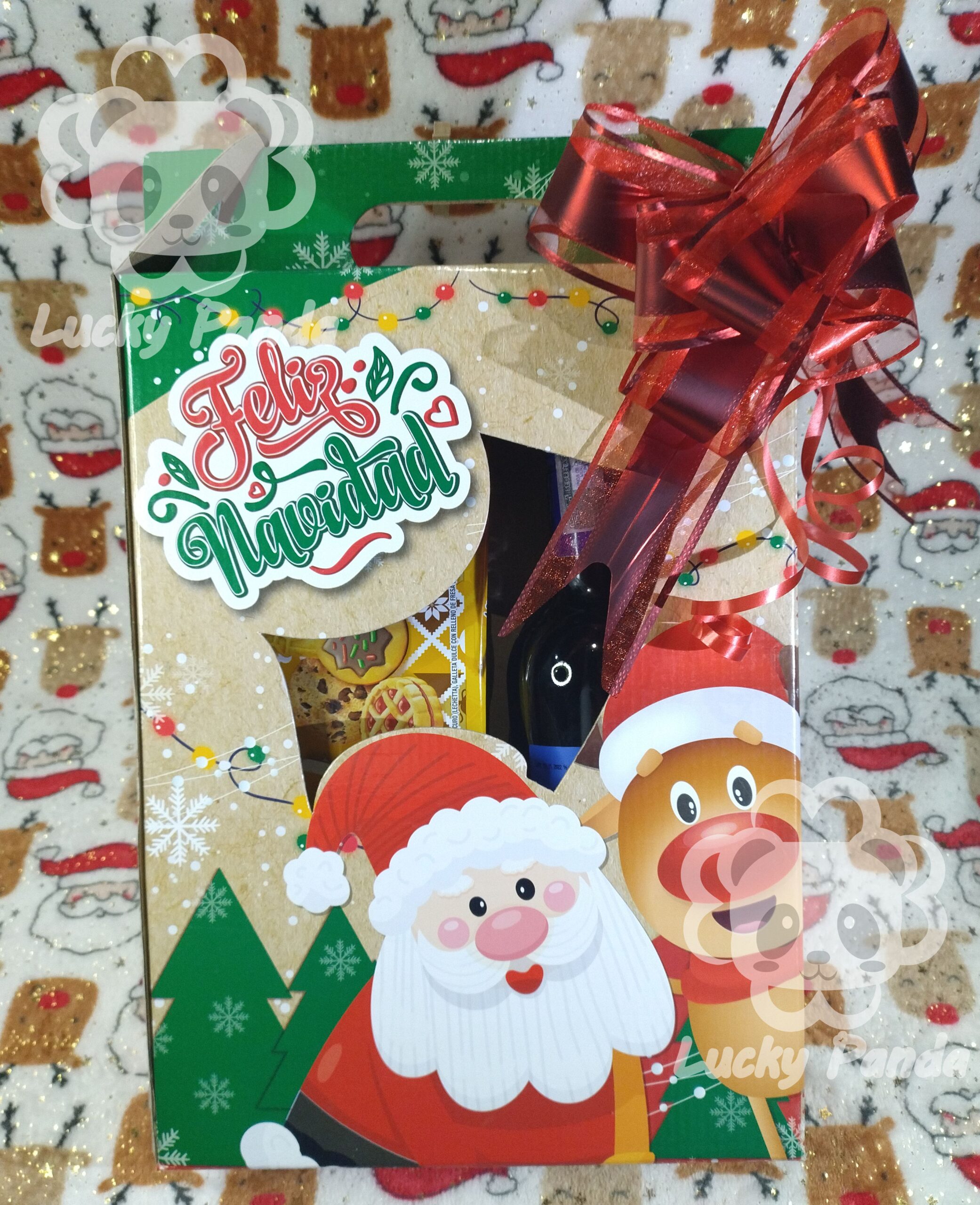 Detalle Navideño contiene: 1 Vino Merlot, 1 Galletas 220gr, Moño Grande, Caja cartón manija estampado navidad